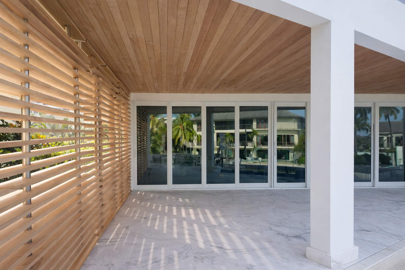 A new wood slat ceiling introduces warmth and contrast to the previously flat white plane, creating a more intimate and visually balanced environment. The installation of a linear wood screen enhances privacy while allowing filtered light and airflow, adding both functional and aesthetic value.